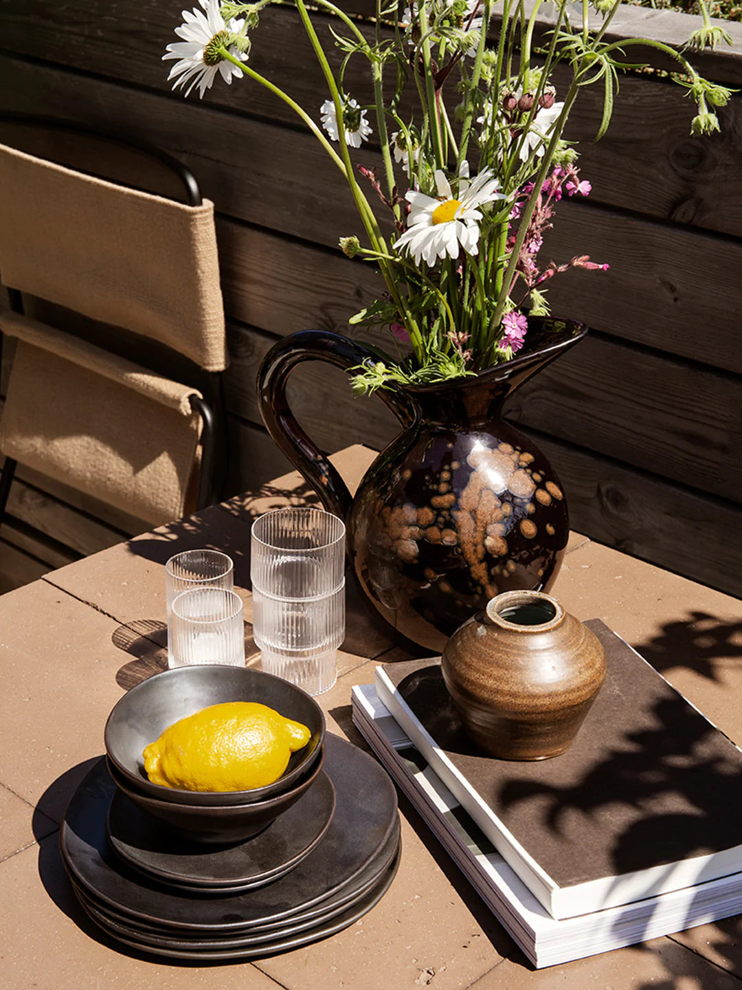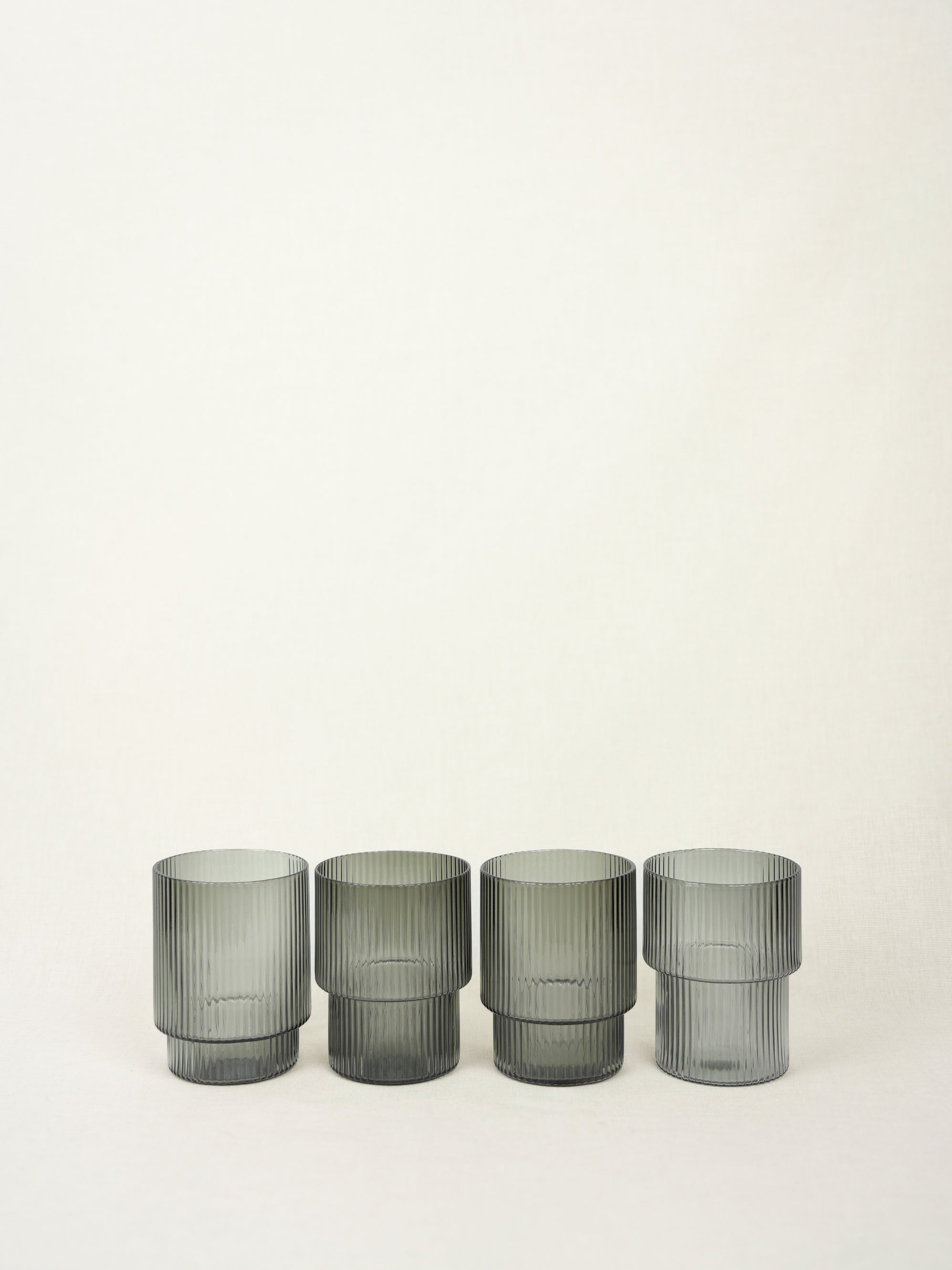 Dieses Set mit vier mundgeblasenen Gläsern zeichnet sich durch eine schöne geriffelte Oberfläche aus. Die vertikalen Wellen bieten eine starke, hochwertige Optik und die verschiedenen geometrischen Formen sorgen für Dynamik und Energie zwischen den Gläsern und erleichtern zudem das Stapeln. Kombinieren sie die Gläser mit der passenden Karaffe zu einem stilvollen Set für das Frühstück, Mittag- oder Abendessen.