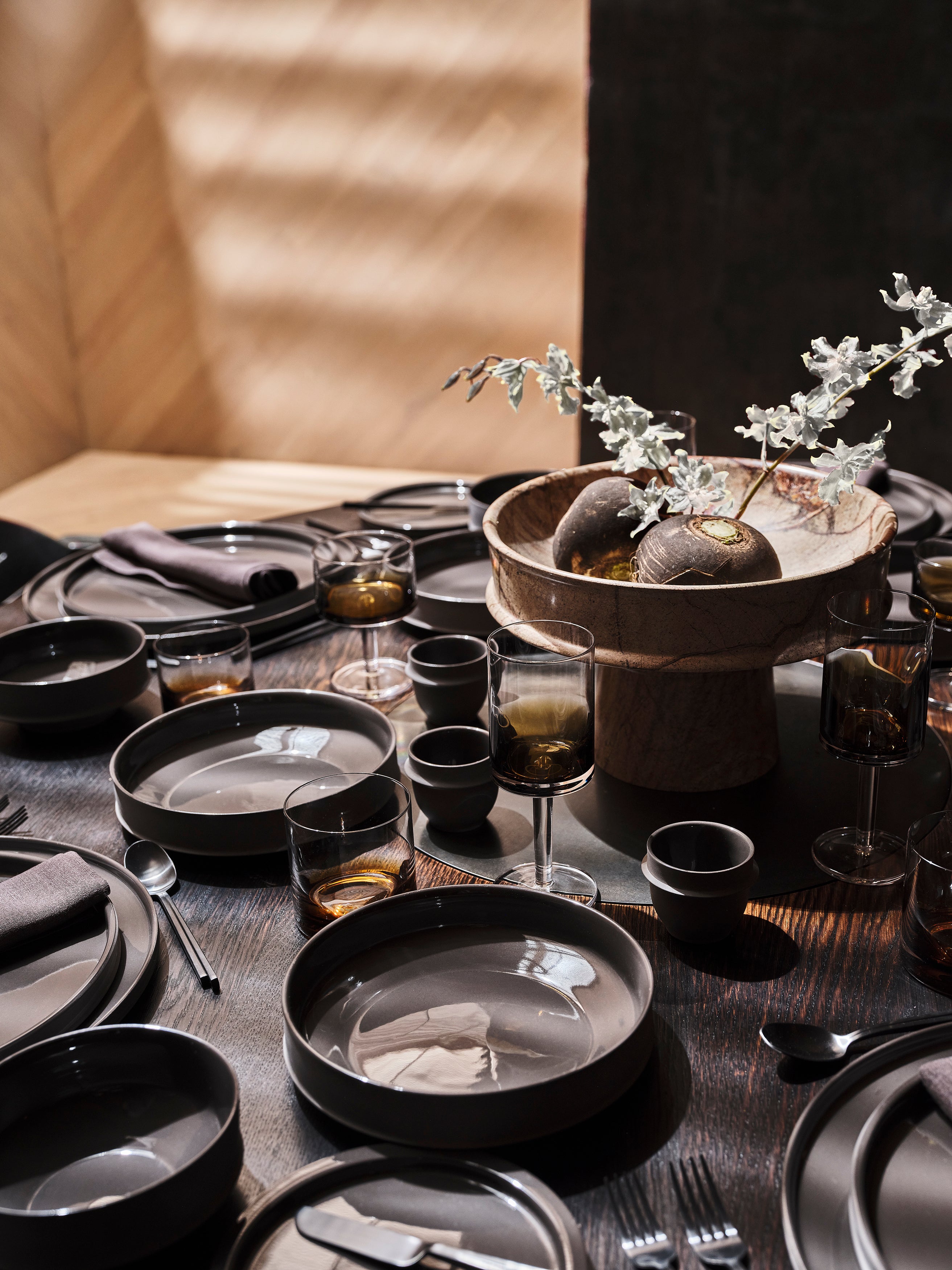 Das Service Dune der amerikanischen Top-Interiordesignerin Kelly Wearstler ist eine raffinierte Anspielung auf die griechische Töpferei der Antike. Durch das Spiel mit zwei Oberflächen – matt und hochglänzend – kommen die skulpturalen Formen der Porzellanteller und -schalen noch besser zur Geltung. Fein abgestimmte Details sorgen dabei jeweils für markantes Volumen und ein harmonisches Gesamtbild. Das in der Masse gefärbte Porzellan ist in drei Erdtönen erhältlich: alabaster, clay und slate.