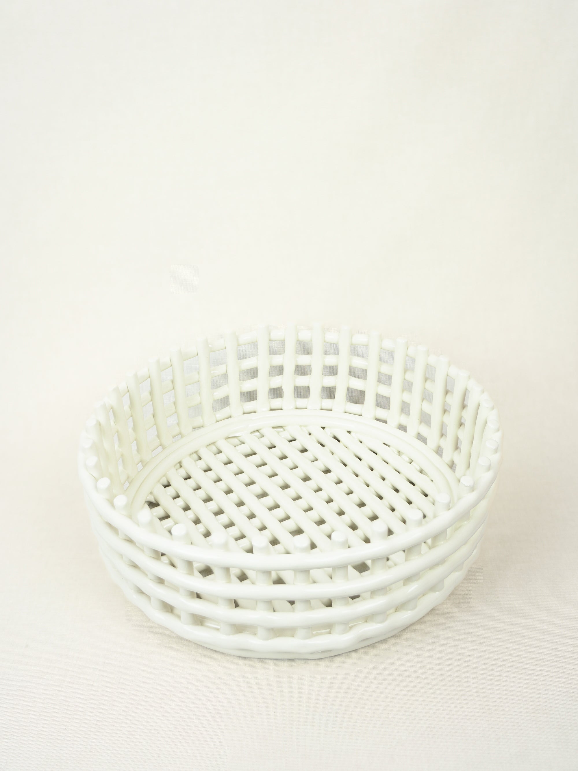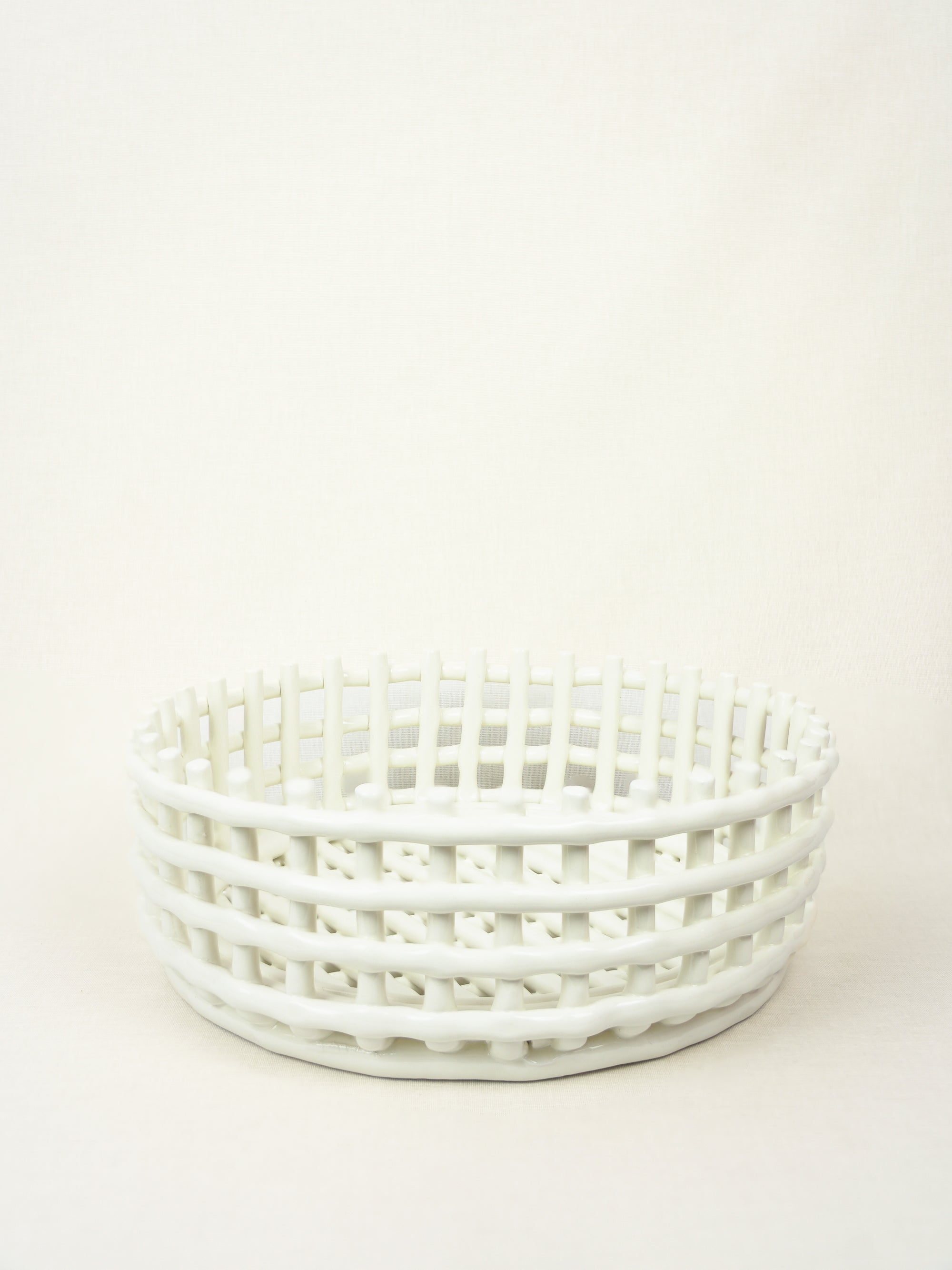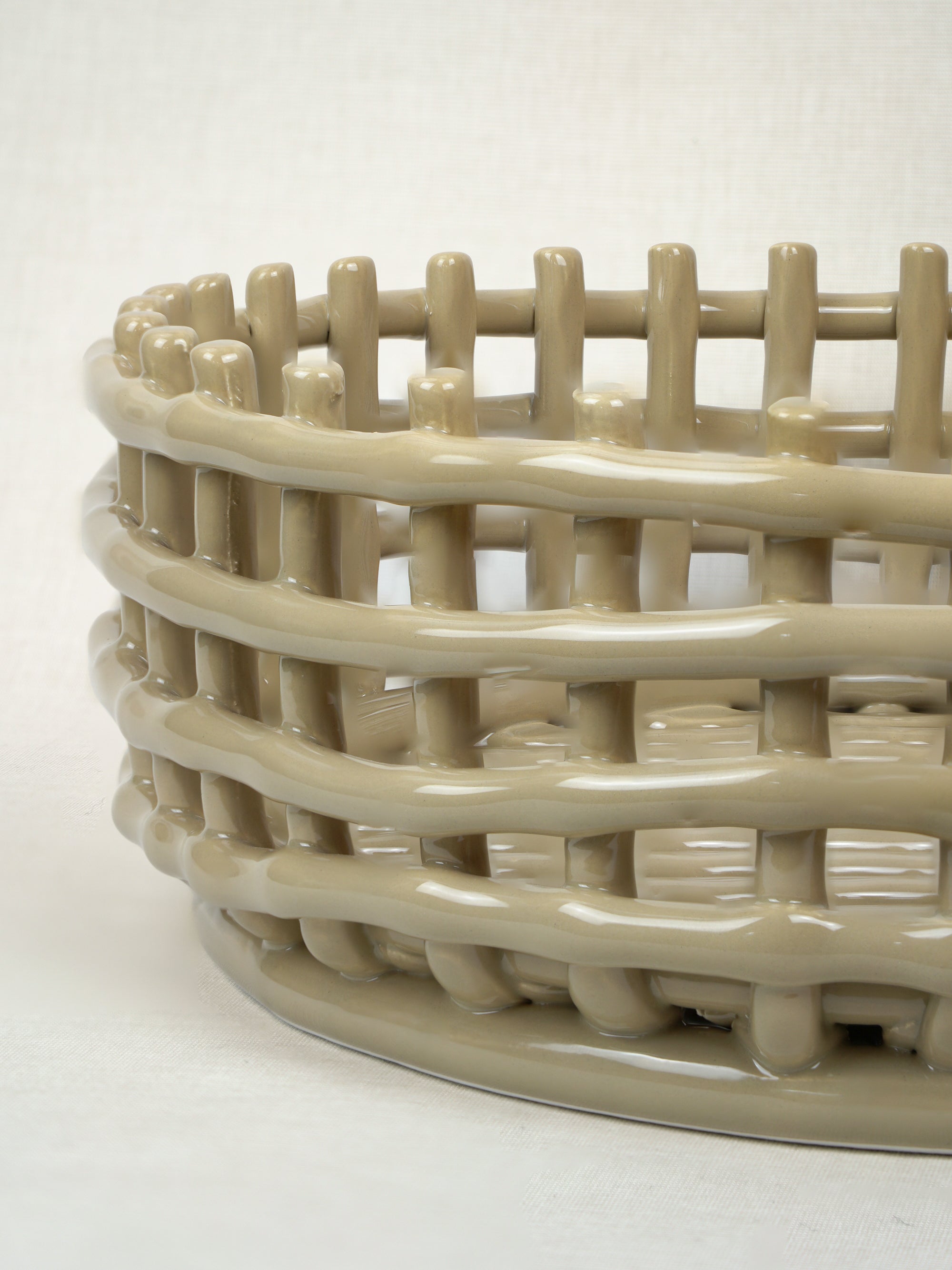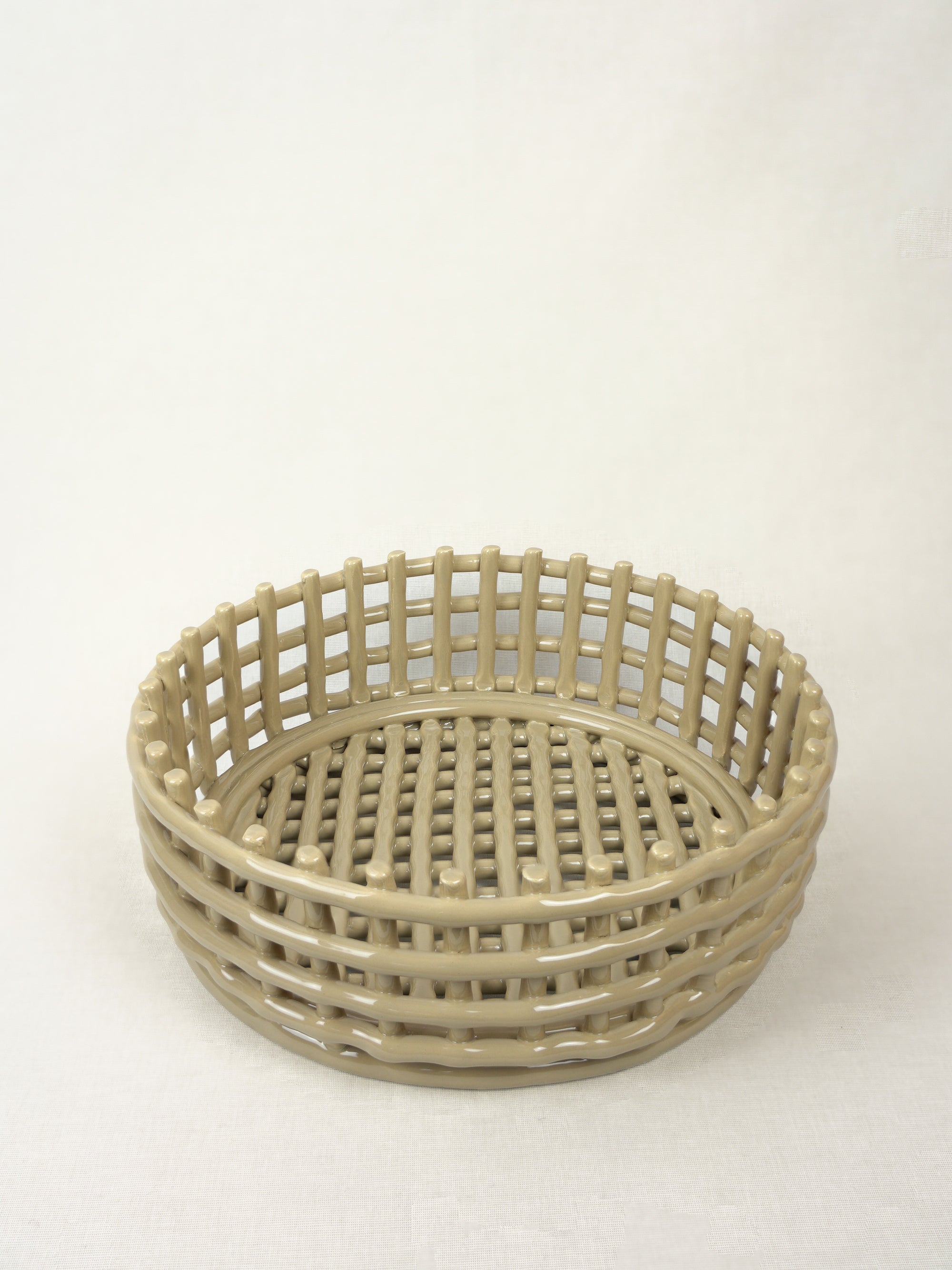Die handgemachten Keramikschalen erwecken das vertraute Gefühl von geflochtenen Behältern und bringen die traditionelle Korbflechterei zur Keramik. Dieses multifunktionale Design eignet sich ideal als Obst- oder Brotkorb und ist bei jeder Tischdekoration bestimmt ein zentraler Bestandteil. Die von Hand geformten und auf kunstvolle Art uneben gefertigten Stücke sind jeweils einzigartig.