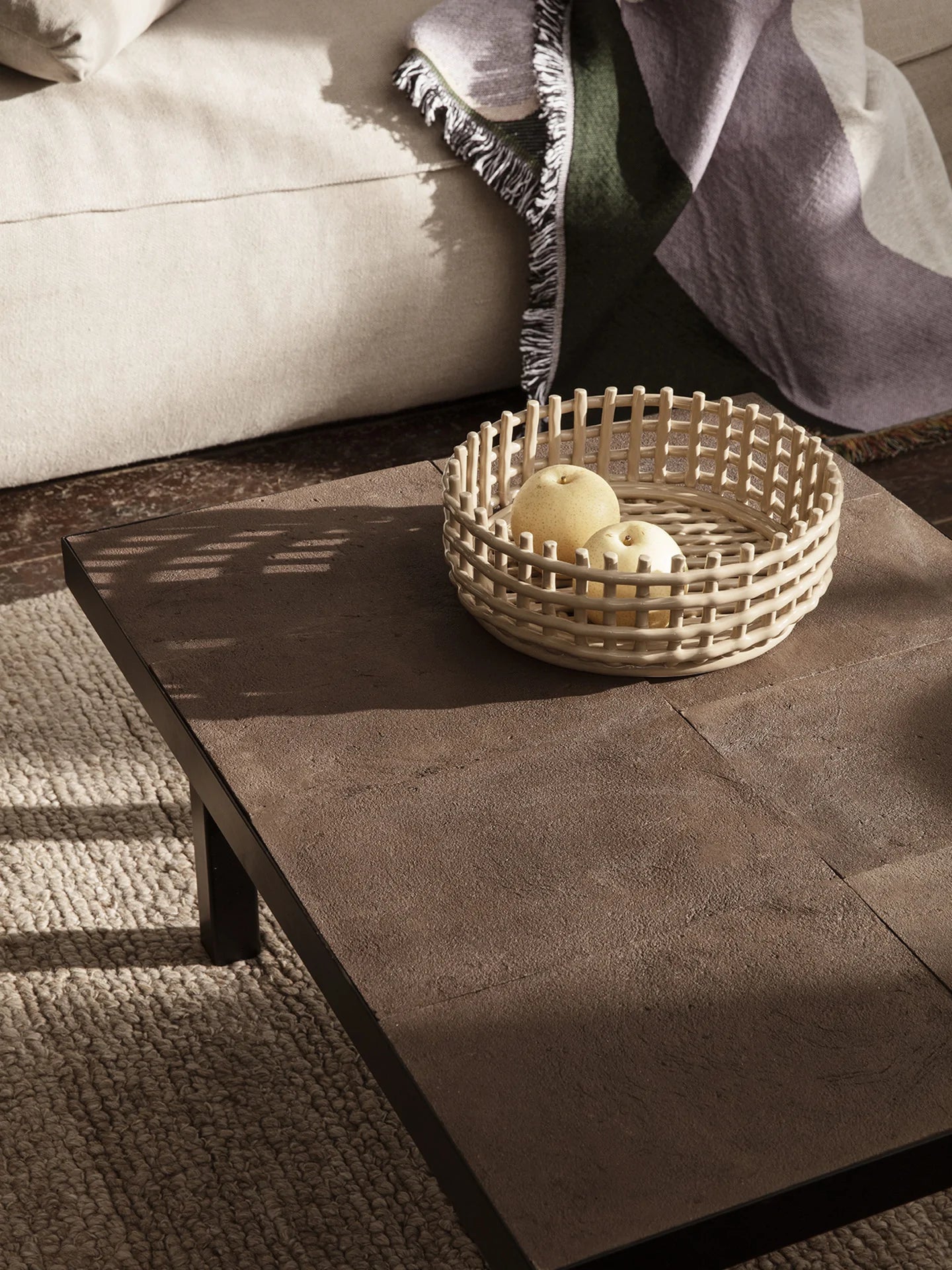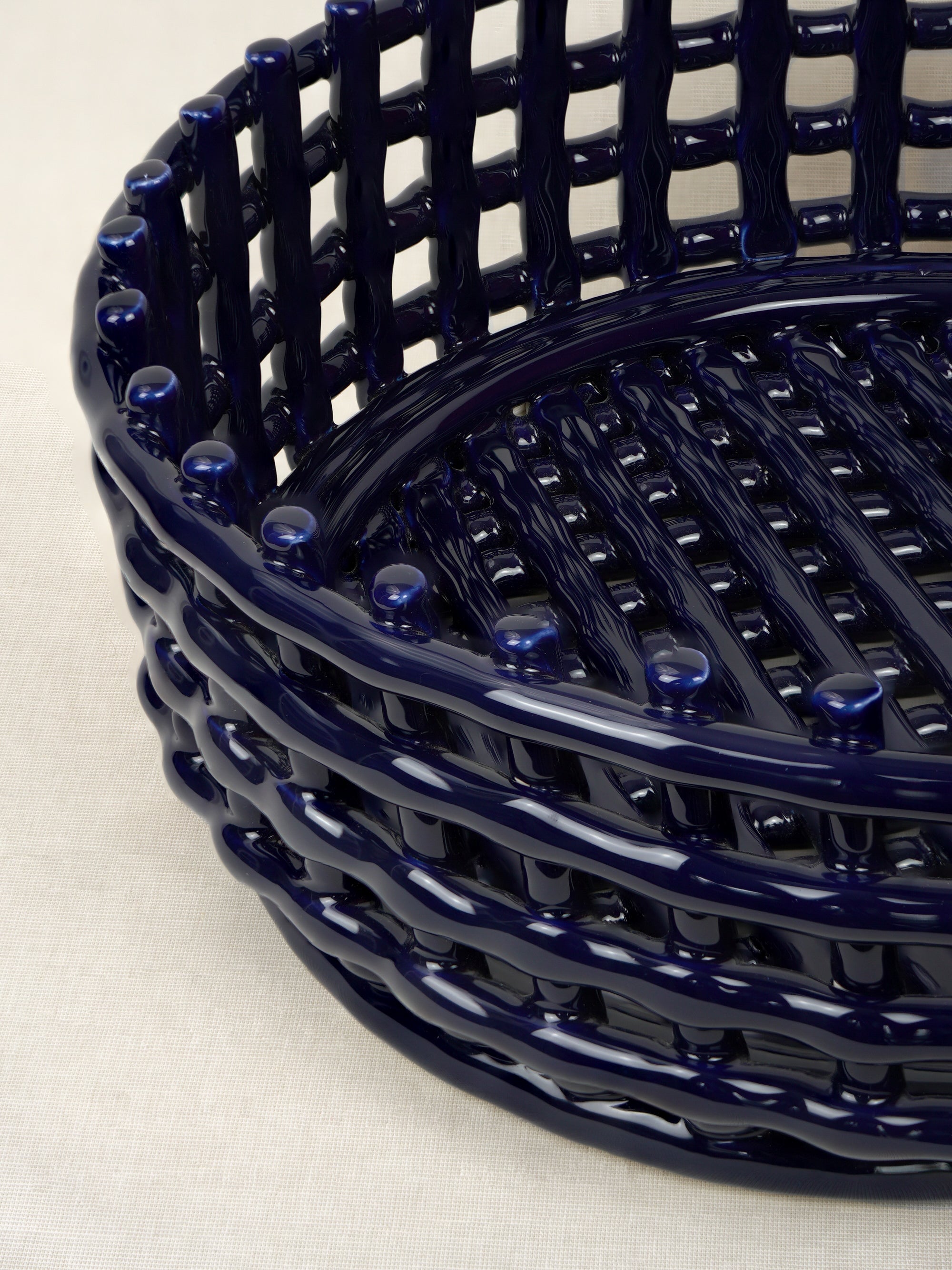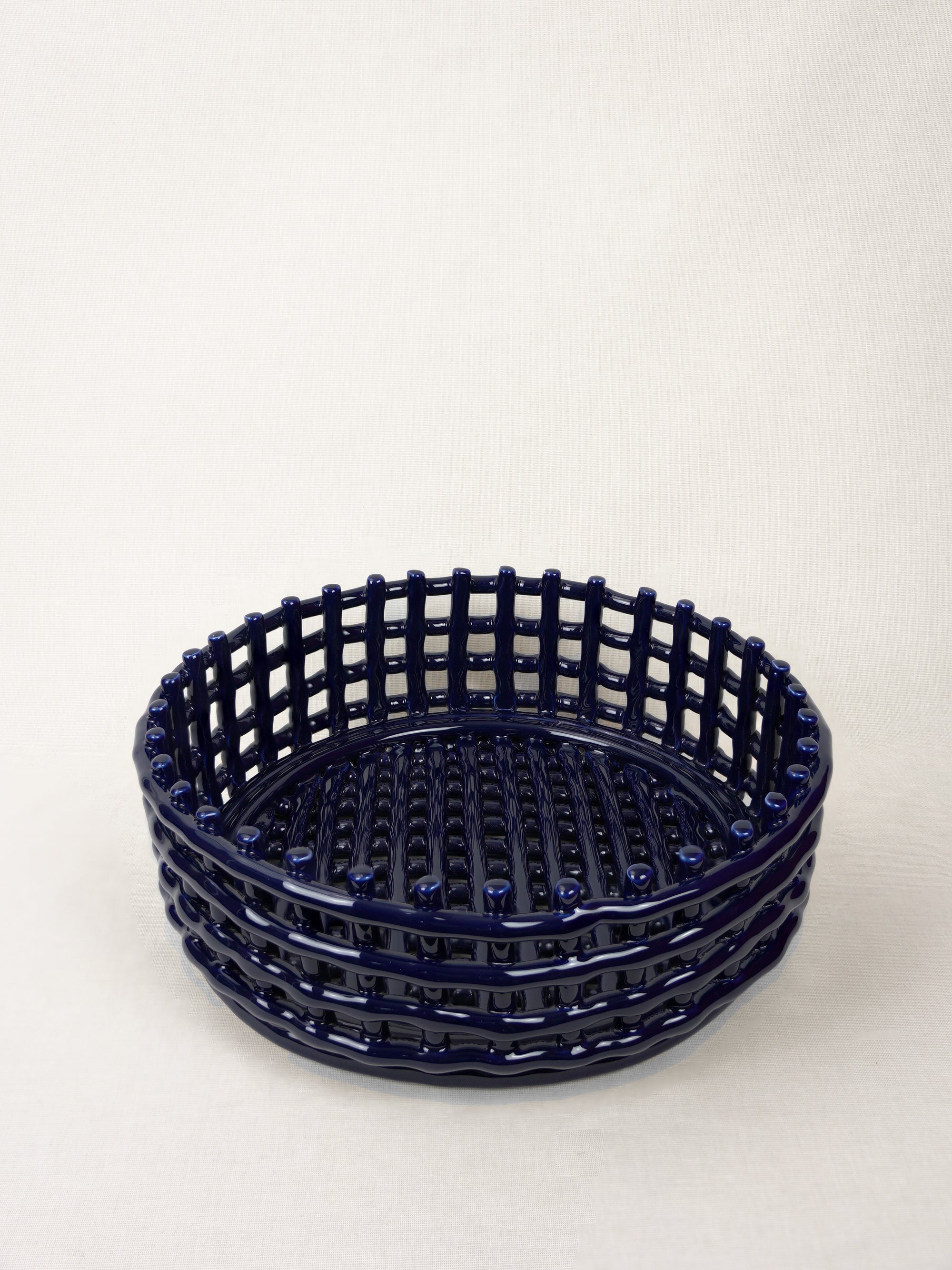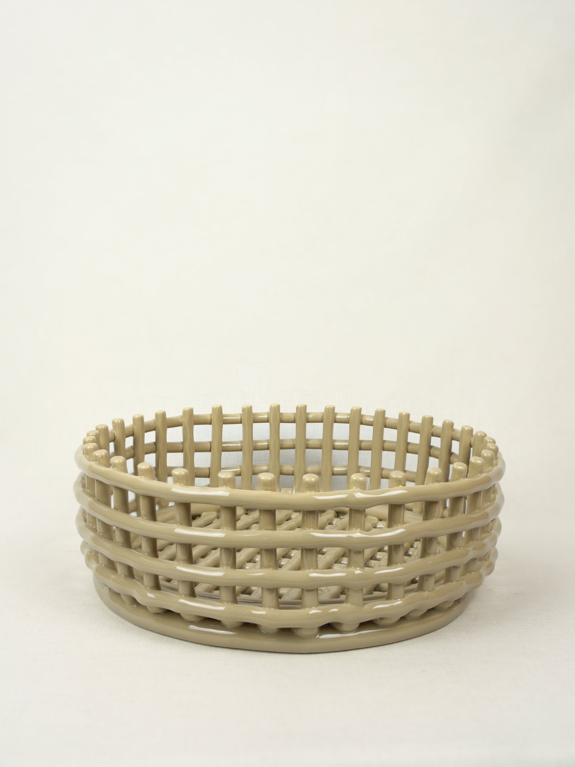 Die handgemachten Keramikschalen erwecken das vertraute Gefühl von geflochtenen Behältern und bringen die traditionelle Korbflechterei zur Keramik. Dieses multifunktionale Design eignet sich ideal als Obst- oder Brotkorb und ist bei jeder Tischdekoration bestimmt ein zentraler Bestandteil. Die von Hand geformten und auf kunstvolle Art uneben gefertigten Stücke sind jeweils einzigartig.