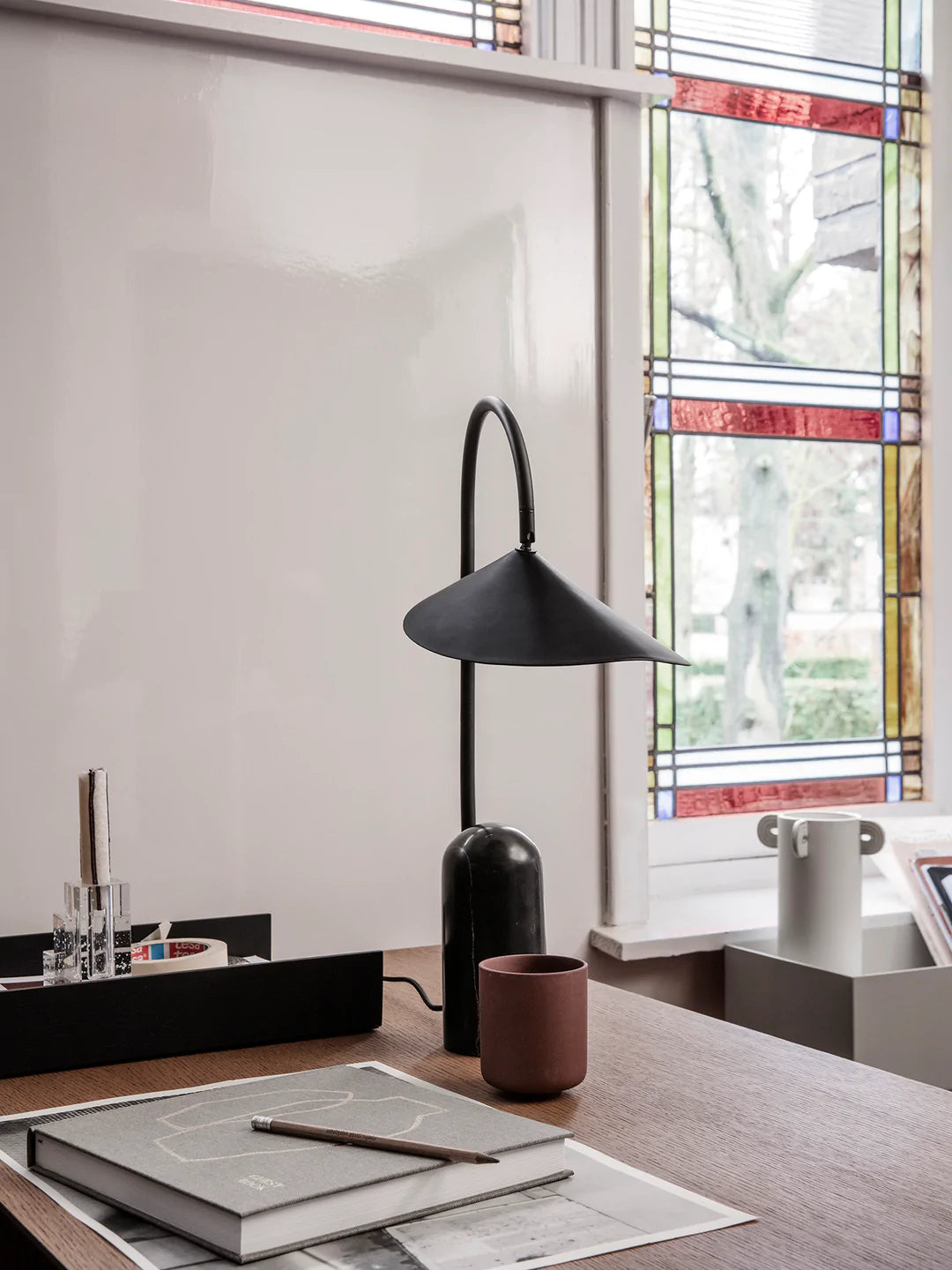 Die „Arum” Tischlampe ist durch seinen soliden, schwarzen Marmorfuß in Kombination mit dem organisch geformten Lampenschirm gekennzeichnet. Um die perfekte Balance in der außermittigen Struktur der Lampe zu erreichen, wirkt der schwarze Marmorfuß als Gegengewicht zu der sanften Art, mit welcher der Lampenschirm an dem Metallbogen hängt – wie ein Blatt am Stängel. Mit dem matten, cremefarbenen Inneren des Schirms, bietet die Lampe ein weiches, gleichmäßig verteiltes Licht. Der Lampenschirm kann nach den jeweiligen Verhältnisse eingestellt werden, damit du in allen Situationen optimale Lichtbedingungen hast.